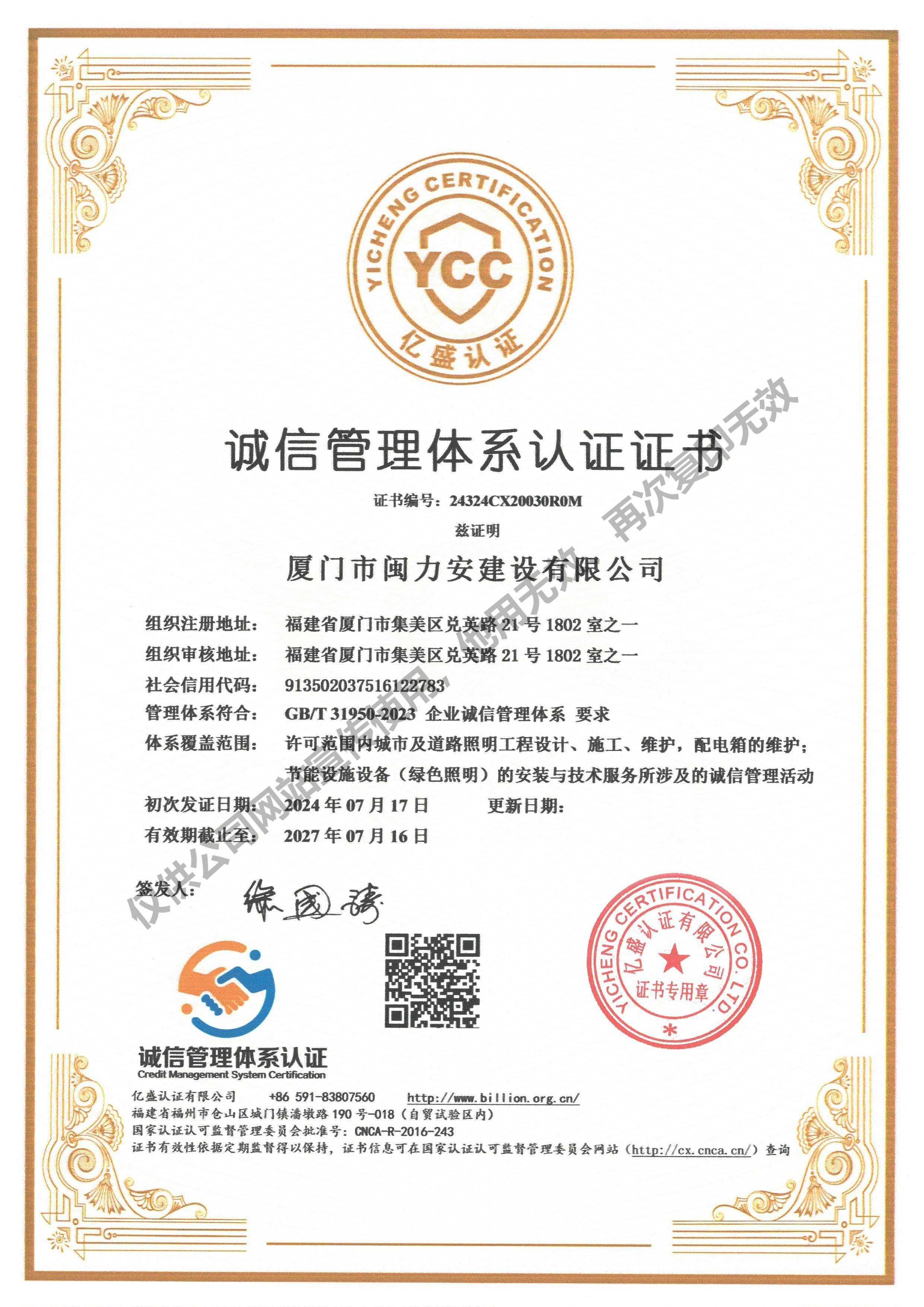 祝賀閩力安取得:誠信管理體系認證證書